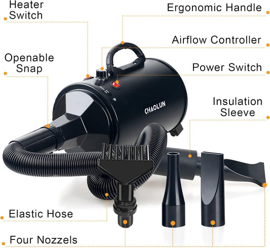 High Velocity Dog Dryer Blower, Professional Dog Grooming Dryer, Dog Blow Dryer, Pet Hair Dryer with Heater, Powerful Blow Force, Adjustable Speed, Quickly Dry, Black